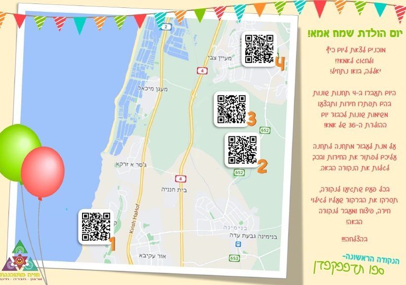 איך חוגגים יומולדת שווה לאמא? בוחרים אזור בארץ, ממלאים שאלון עם חומר מעניין עליה, ומקבלים משחק ניווט שווה הכולל חידות ומשימות עד שמגיעים לנקודת היעד! במשחק הזה כללנו גם משימות לילדים וגם משימות רומנטיות להורים! יצא מוצלח!